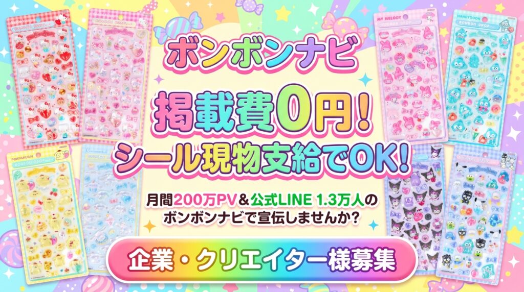 【掲載費0円】月間200万PVの「ボンボンナビ」で、あなたの新作シールを全力宣伝します!(現物支給プラン)