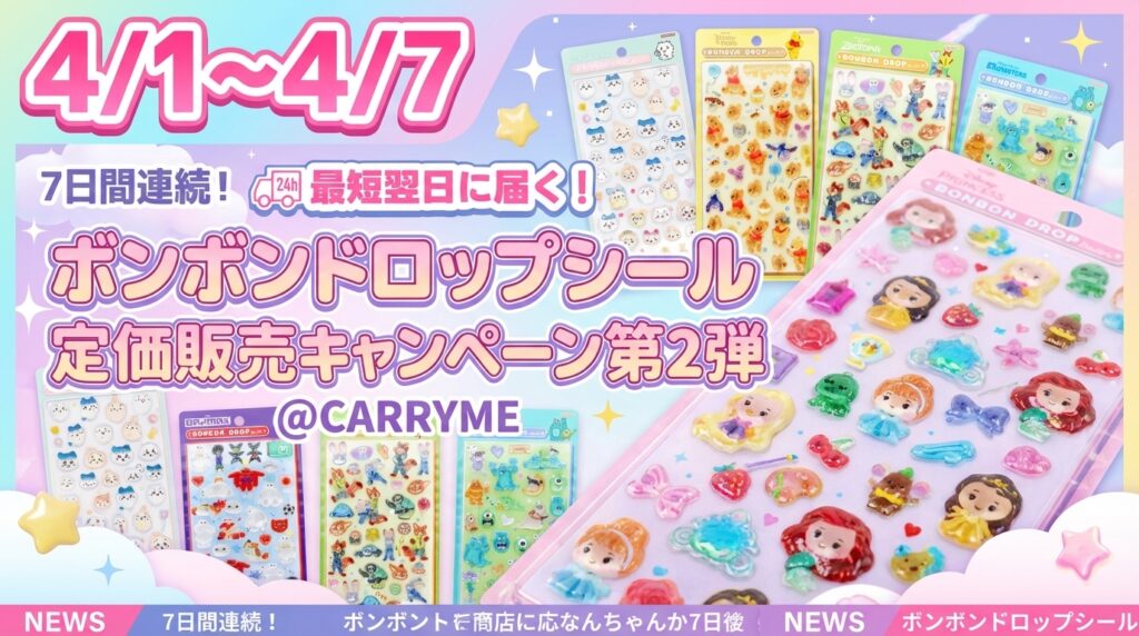 【4/1~4/7】サンリオ・ディズニー・ちいかわ ボンボンドロップシールの定価販売キャンペーン第2弾が決定!@CARRYME