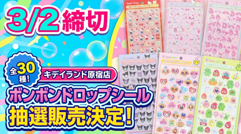 【3/2締切】全30種!ディズニー・サンリオ・和柄・オリジナルボンボンドロップシールの抽選が決定!@キデイランド原宿店