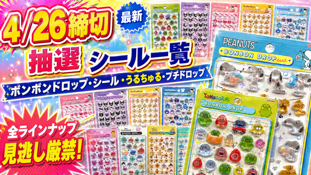 【4/24締切】全4種!サンリオ大のボンボンドロップシールの抽選販売が決定!@パーティリコ アリオ亀有店