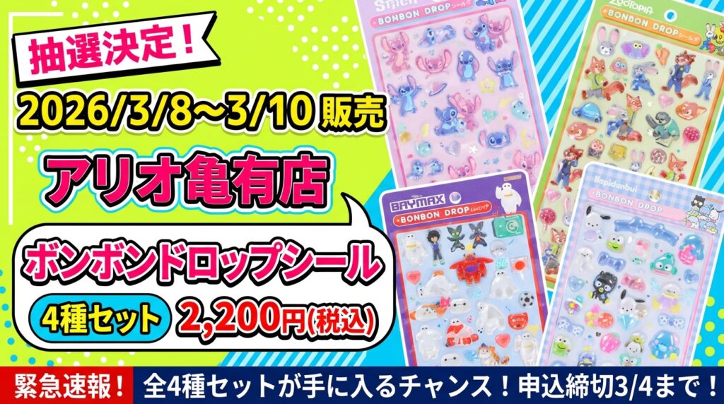 【3/4締切】ズートピアあり!ディズニーボンボンドロップシールの抽選販売が決定!@パーティリコ アリオ亀有店