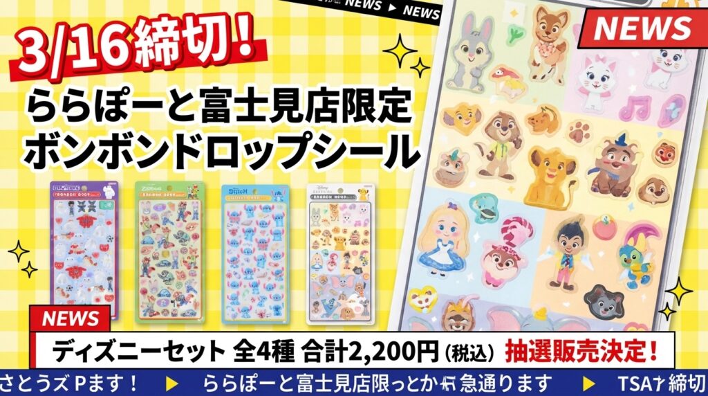 【3/12締切】ディズニー&サンリオミニ4種!ボンボンドロップシールの抽選販売が決定!@パーティリコ アリオ亀有店