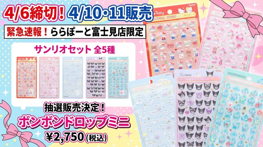 【4/6締切】全5種!サンリオキャラクターズ ボンボンドロップミニの抽選販売が決定!@ららぽーと富士見店