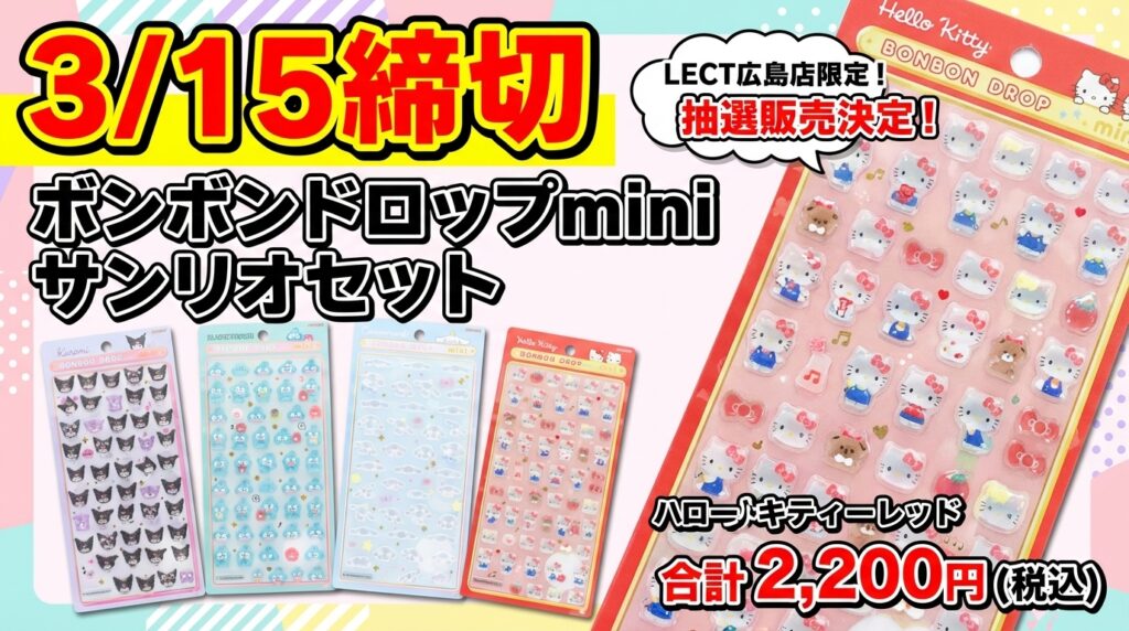 【3/10締切】サンリオ大5種!ボンボンドロップシールの抽選販売が決定!@パーティリコ ららぽーと富士見店