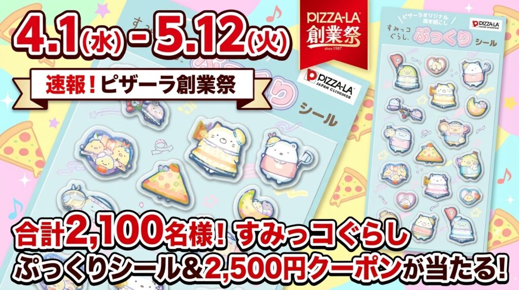 【5/12締切】すみっコぐらしぷっくりシールなどが当たる!創業祭プレゼントキャンペーンが決定!@ピザーラ