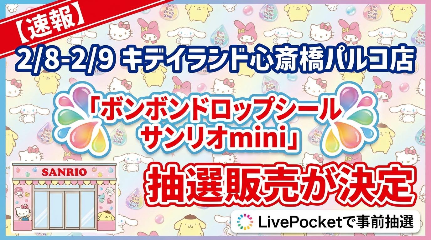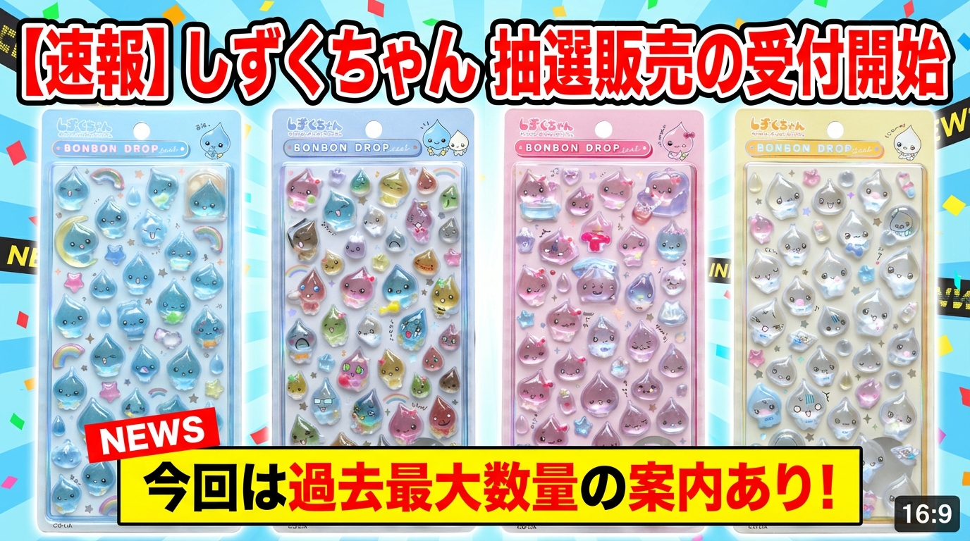 ボンボンドロップシール公式の告知で、しずくちゃんの抽選販売が受付開始になりました。先着ではなく抽選方式、さらに今回は過去最大数量を用意する旨の記載があり、前回よりチャンスが広がる可能性があります。応募は指定のルールに沿って行うのが安全です。