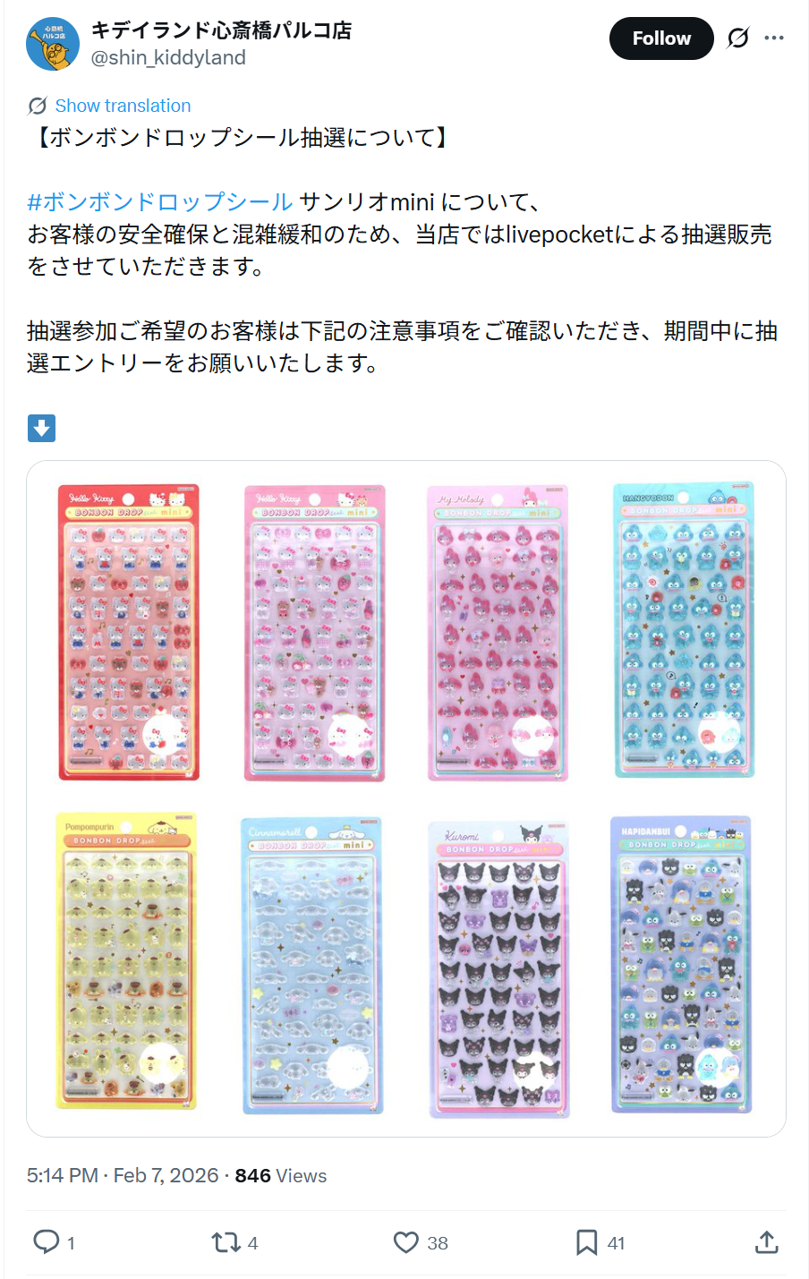 サンリオminiは人気が集中しやすく、店舗側も混雑の発生を前提に運用を組んでいます。過去のボンドロ系の告知でも、同様にLivePocket抽選での購入整理券配布が採用されています。