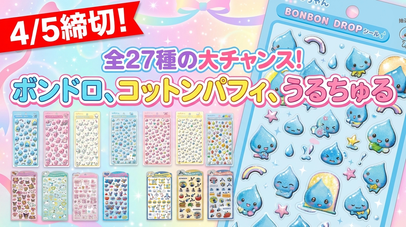 【2/23締切】全36種!たまごっち・ディズニー・サンリオの抽選販売 2026 2/21 広告 抽選・プレゼント 2026年2月21日 \1日1回、再販チェックしよう/(購入報告多数) 【サンスター文具】プチトレイン ボンボンドロップシール Amazonで探す 楽天で探す メルカリで探す 【サンスター文具】ボンボンドロップシール mofusand(モフサンド) Amazonで探す 楽天で探す メルカリで探す 【サンスター文具】ボンボンドロップシール ディズニー クラシック Amazonで探す 楽天で探す メルカリで探す サンスター文具(Sun-Star Stationery) ボンボンドロップシール たまごっち めめっち Amazonで探す 楽天で探す メルカリで探す \公式LINE15,000人突破🎉/【ディズニークラシック】【モフサンド】が当たるプレゼント抽選開催中! \抽選情報の最新まとめはこちら/ ボンボンナビ 【毎日更新】ボンボンドロップシールの抽選・予約情報まとめ \抽選情報の最新まとめはこちら/ ボンボンナビ 【毎日更新】ボンボンドロップシールの抽選・予約情報まとめ サンスター文具(Sun-Star Stationery) ボンボンドロップシール サンリオ Amazonで探す 楽天で探す メルカリで探す サンスター文具(Sun-Star Stationery) ボンボンドロップシール サンリオ大 Amazonで探す 楽天で探す メルカリで探す シール帳 クロミ カミオジャパン Amazonで探す 楽天で探す メルカリで探す \公式LINE15,000人突破🎉/【ディズニークラシック】【モフサンド】が当たるプレゼント抽選開催中! 抽選・プレゼント よかったらシェアしてね! URLをコピーしました! URLをコピーしました! 新着記事 【4/7締切】サンリオのボンボンドロップシールセットの抽選販売が決定!@パーティリコ ザザ・モール仙台長町店 【4/7締切】ボンボンドロップシールの抽選販売が決定!@パーティリコ いわき小名浜店 【4/6締切】全10種!サンリオmini・しずくちゃんminiの抽選販売が決定!@梅田ロフト|クロミ・シナモロール・ハンギョドン・マイメロディ他 【4/5締切】ディズニー ボンボンドロップシールminiの抽選販売が決定!前回1000名以上が当選した伝説の大チャンス再び!@クーリア公式 【4/4締切】全8種!サンリオ・たまごっちのボンボンドロップシール抽選販売が決定!@キデイランド心斎橋店 【新作】4/7発売!サンリオキャラクターズマンチョコがセブン限定で登場!全20種のキラキラシールが可愛すぎる! 関連記事 【4/7締切】サンリオのボンボンドロップシールの抽選販売@ザ・モール仙台長町店 2026年4月4日 【4/7締切】ボンボンドロップシールの抽選販売@パーティリコ いわき小名浜店 2026年4月4日 【4/6締切】ボンボンドロップシールの抽選販売@梅田ロフト 2026年4月4日 【4/5締切】ディズニー ボンボンドロップシール ミニの抽選販売@クーリア公式 2026年4月4日 【4/4締切】サンリオ・たまごっちのボンボンドロップシールの抽選販売@キデイランド心斎橋店 2026年4月3日 【4/5締切】人気シールの抽選販売@キデイランドららぽーと富士見店 2026年4月3日 【5/3限定】三島食品ふりかけぷっくりシールのポイント交換@フレスタ全店舗 2026年4月2日 【5/12締切】すみっコぐらしぷっくりシールなどのプレゼントキャンペーン@ピザーラ 2026年4月2日