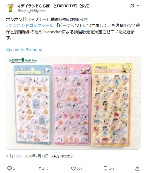 キデイランドららぽーとEXPOCITY店で、スヌーピー(PEANUTS)ボンボンドロップシールの購入券が事前抽選(LivePocket)で配布される案内が出ました。エントリーは3日間だけ…