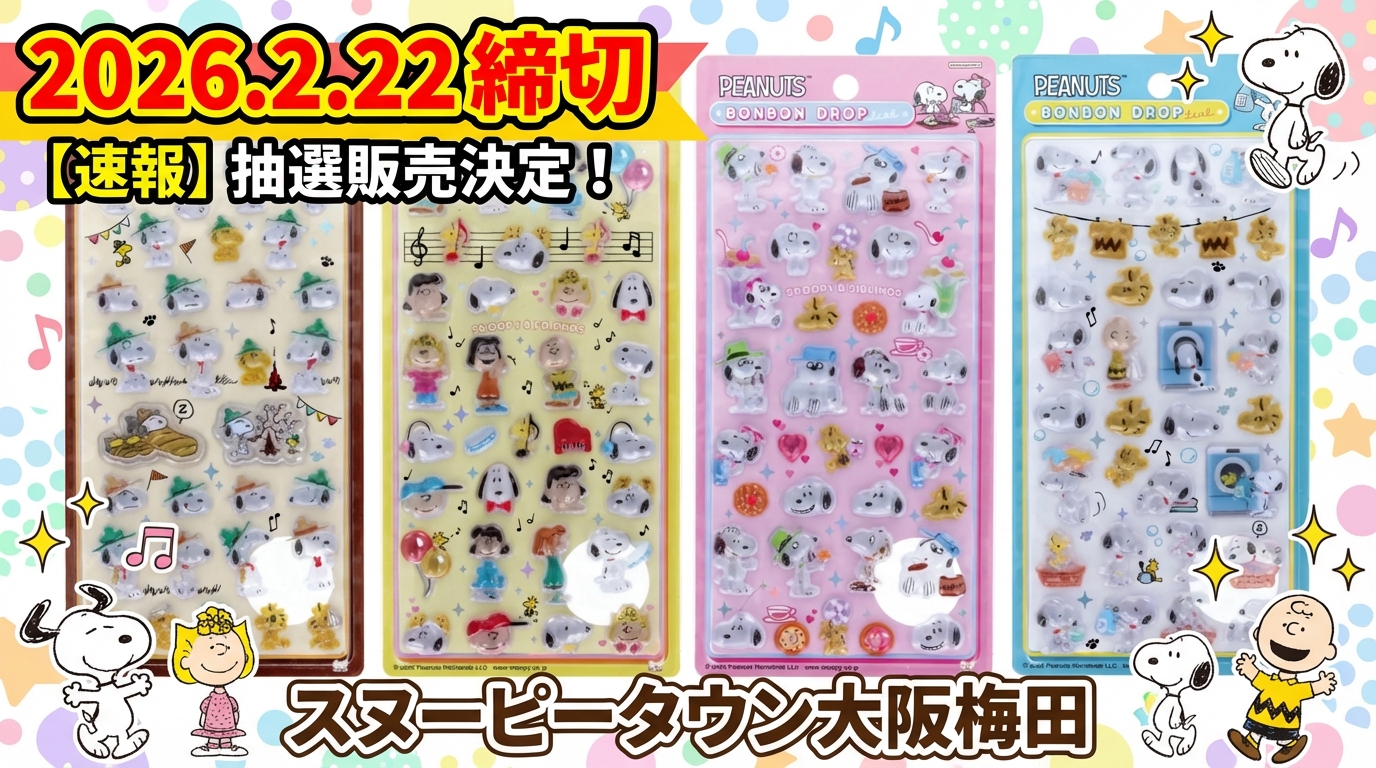 スヌーピータウンショップ大阪梅田店でのボンボンドロップシール販売は、2026年2月20日から22日までの3日間限定で抽選申し込みが行われます。