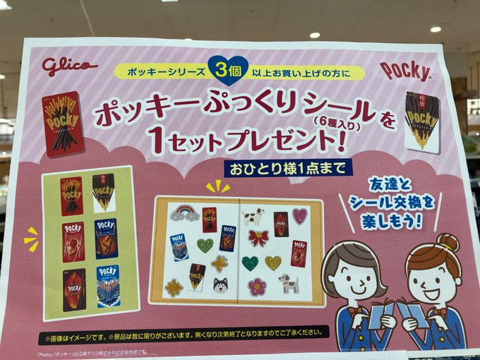 江崎グリコのポッキーを購入するともらえるぷっくりシールプレゼントキャンペーンは、全国のイオンや大手量販店で現在開催中です。商品はステッカー1種類のみですが、立体感が可愛いシールがセットになっておりSNSでも話題ですので、無くなり次第終了となる前にお近くの売り場をチェックしてみてください。