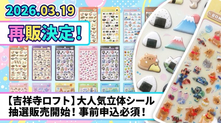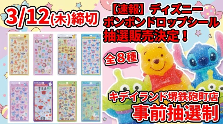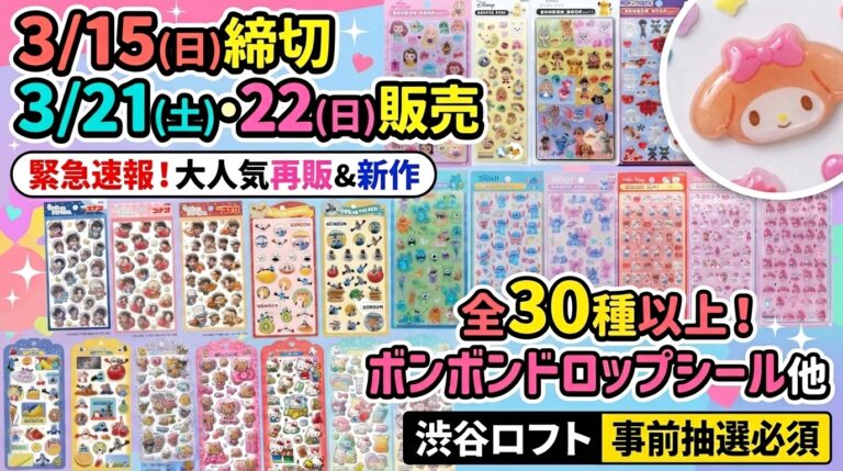 ボンボンドロップシールは人気が高く、店舗や催事によっては抽選販売や抽選入場になることがあります。ここでは、本日時点で判明している抽選・予約情報を「抽選販売/入場」と「プレゼント」に分けてまとめました。