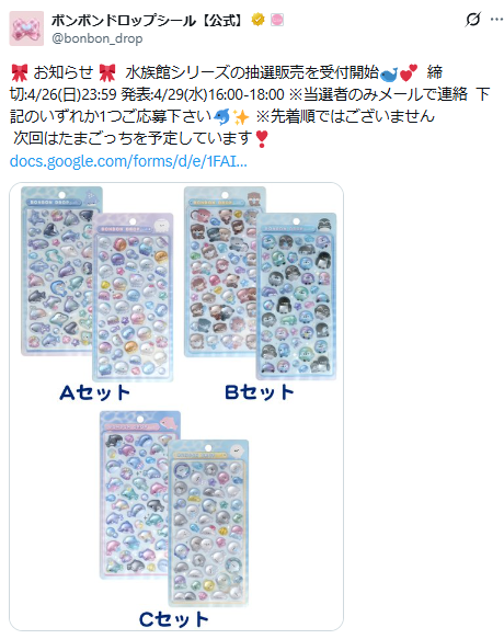 水族館 ボンボンドロップシールの抽選販売が、2026年4月26日(日)23:59まで受付中です。