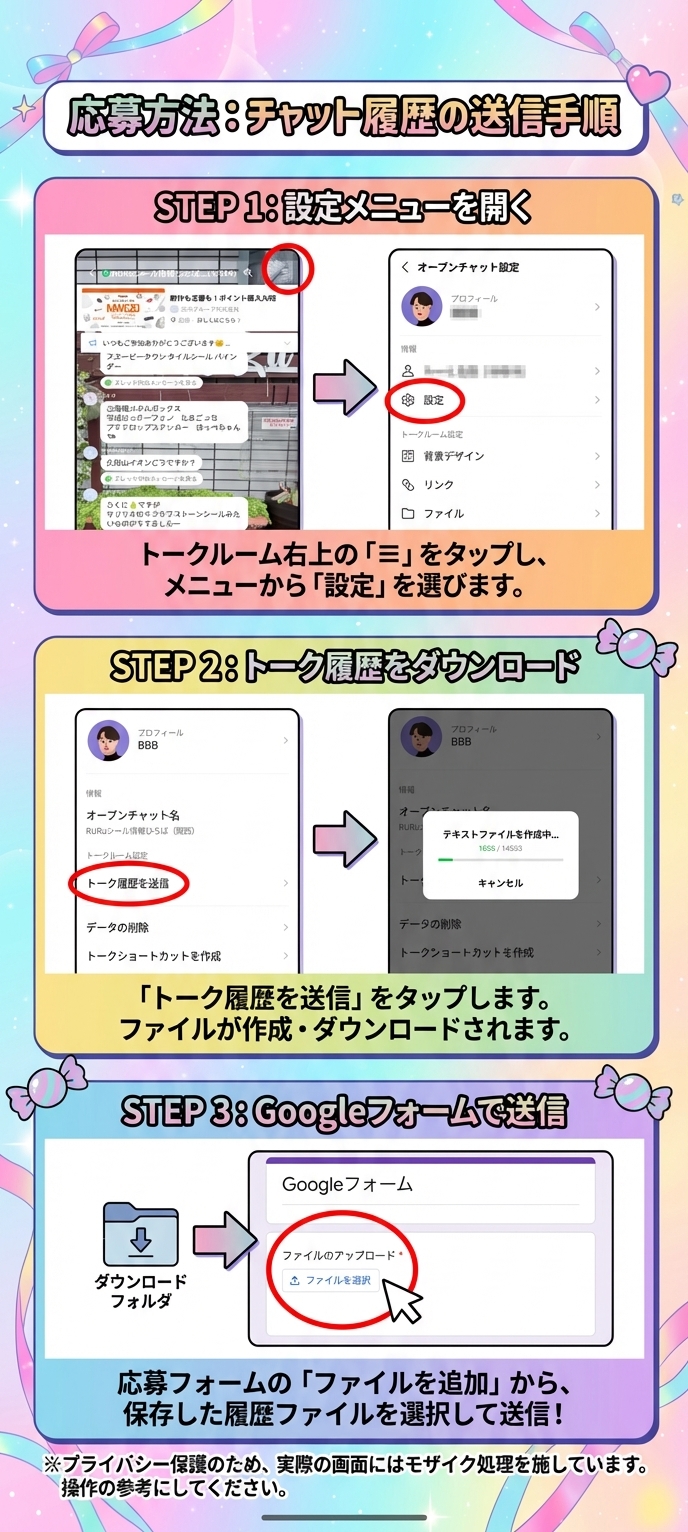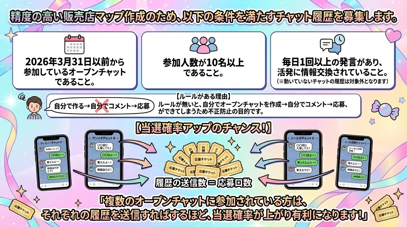 • 複数のオープンチャットに参加されている方は、それぞれの履歴を送信すればするほど、当選確率が上がり有利になります!