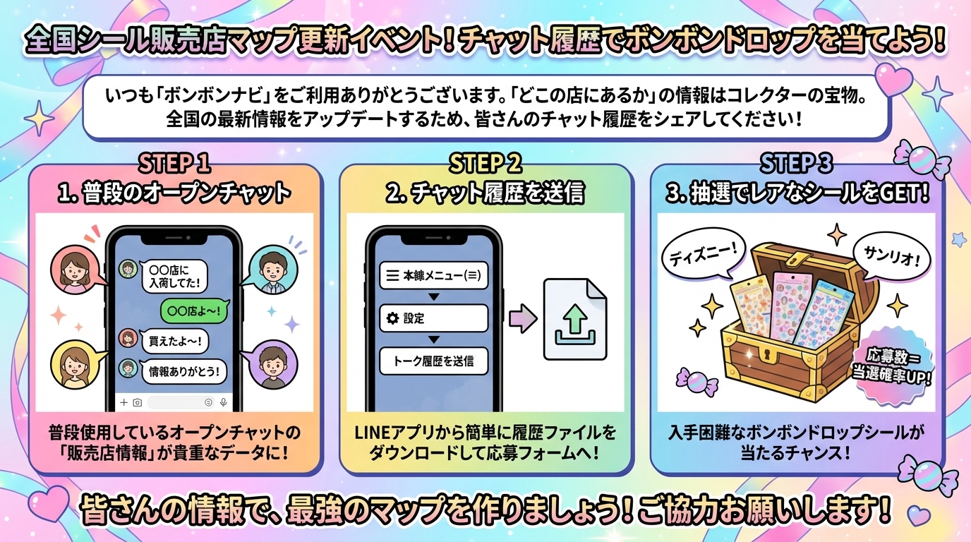 【参加型イベント】販売店マップをみんなで更新!オプチャの履歴を送ってボンボンドロップシール「ディズニー&サンリオ大」が16名に当たる!