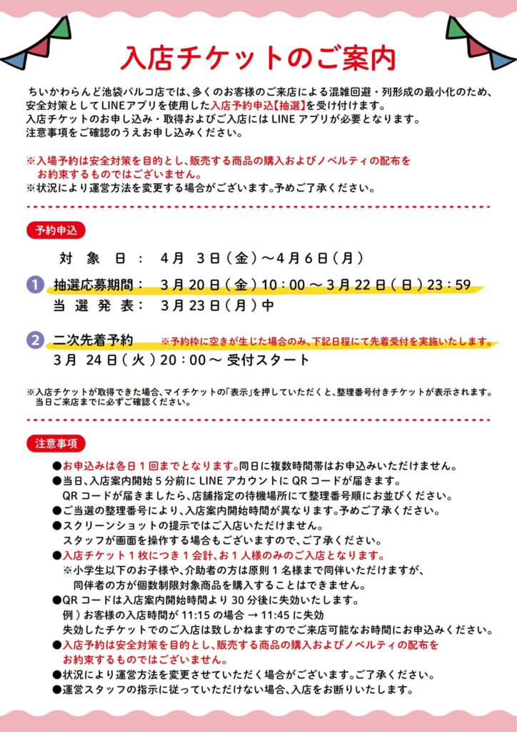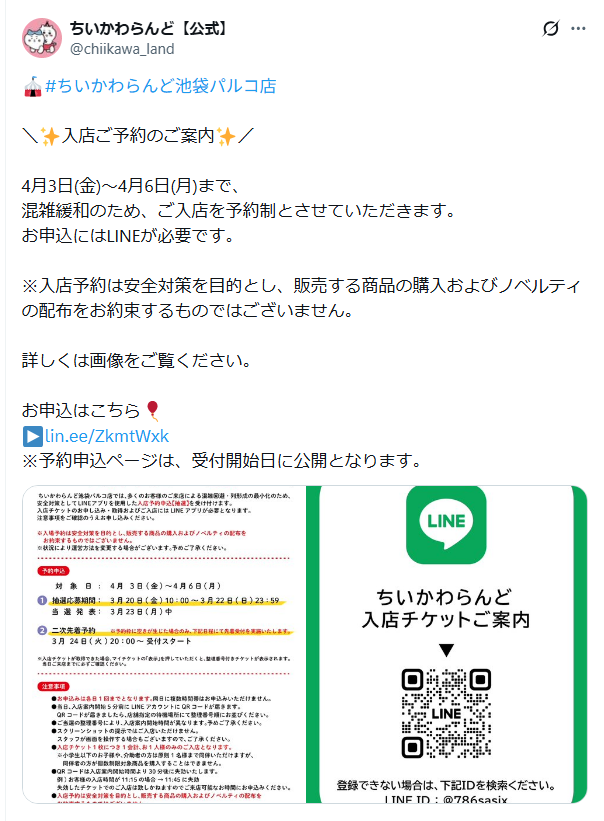 ちいかわらんど池袋パルコ店の4月3日から4月6日までの入店は、LINEを使用した事前抽選予約制となります。
