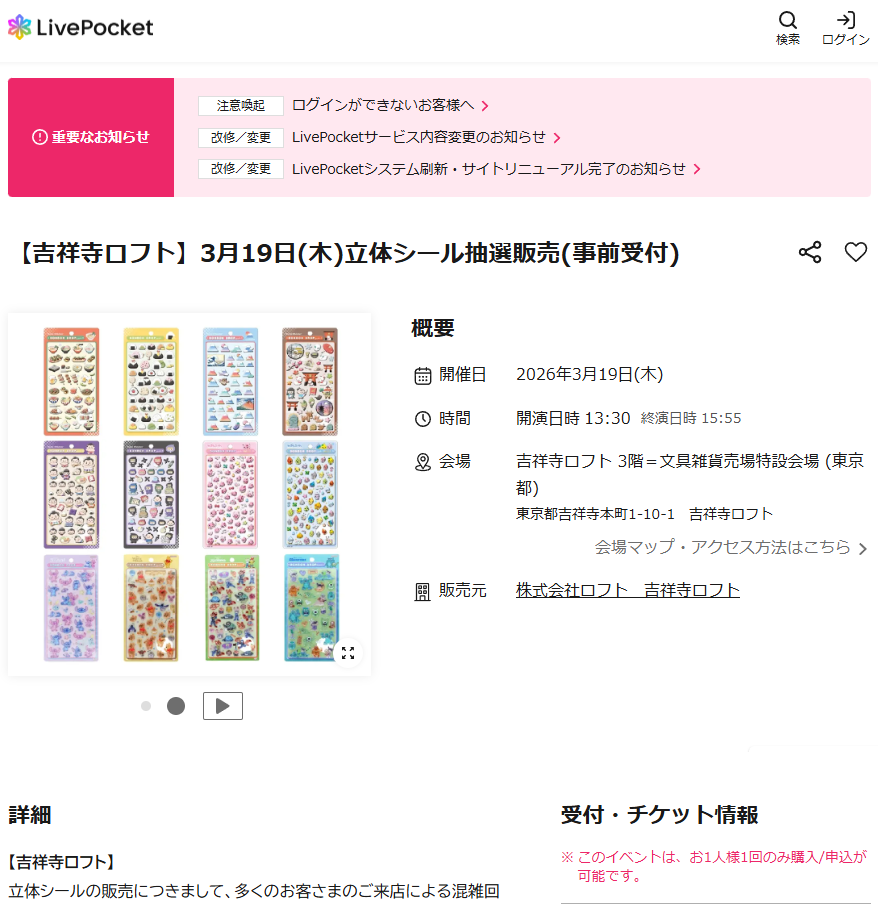 吉祥寺ロフトで開催される立体シールの抽選販売は、混雑緩和を目的とした完全事前予約制です。