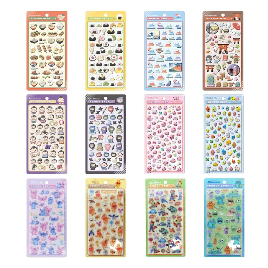 抽選ページに掲載されていた画像をもとに、当日販売される可能性のあるボンボンドロップシールを一覧でご紹介します。なお、公式の案内にもある通り、販売する商品についての店舗へのお問い合わせはお受けできないとのことですのでご注意ください。