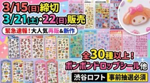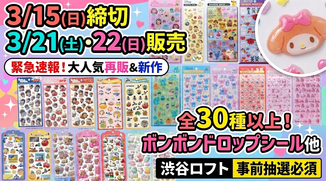大人気のボンボンドロップシールを含む立体シールについて、吉祥寺ロフトでの事前抽選販売が発表されました。SNSなどでも話題沸騰中で入手困難なアイテムということもあり、今回の販売も大きな反響が予想されます。