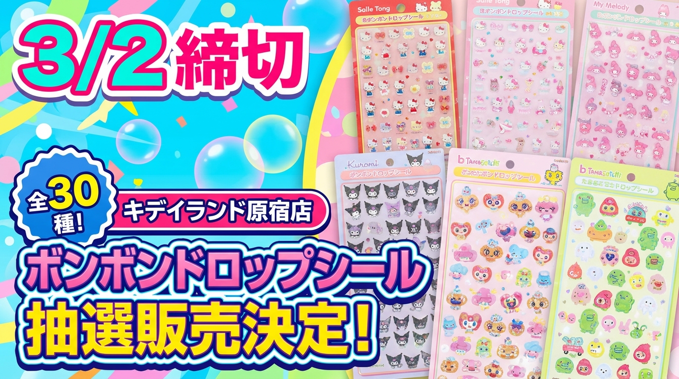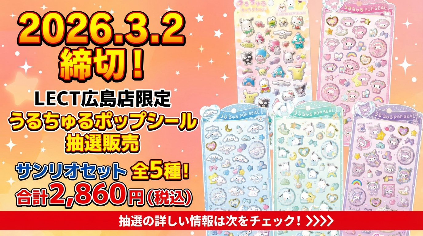 パーティリコ LECT広島店での「うるちゅるポップシール サンリオセット」抽選販売は、2026年3月2日(月)23:59が締め切りです。