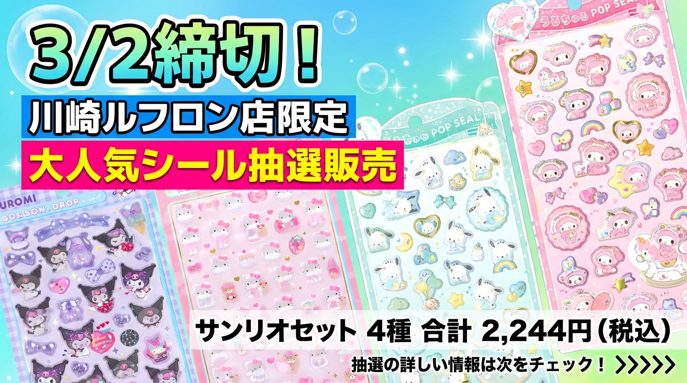 今回、広島県の「パーティリコ LECT広島店」にて、入手困難となっていた「うるちゅるポップシール サンリオセット」の抽選販売が緊急決定しました。