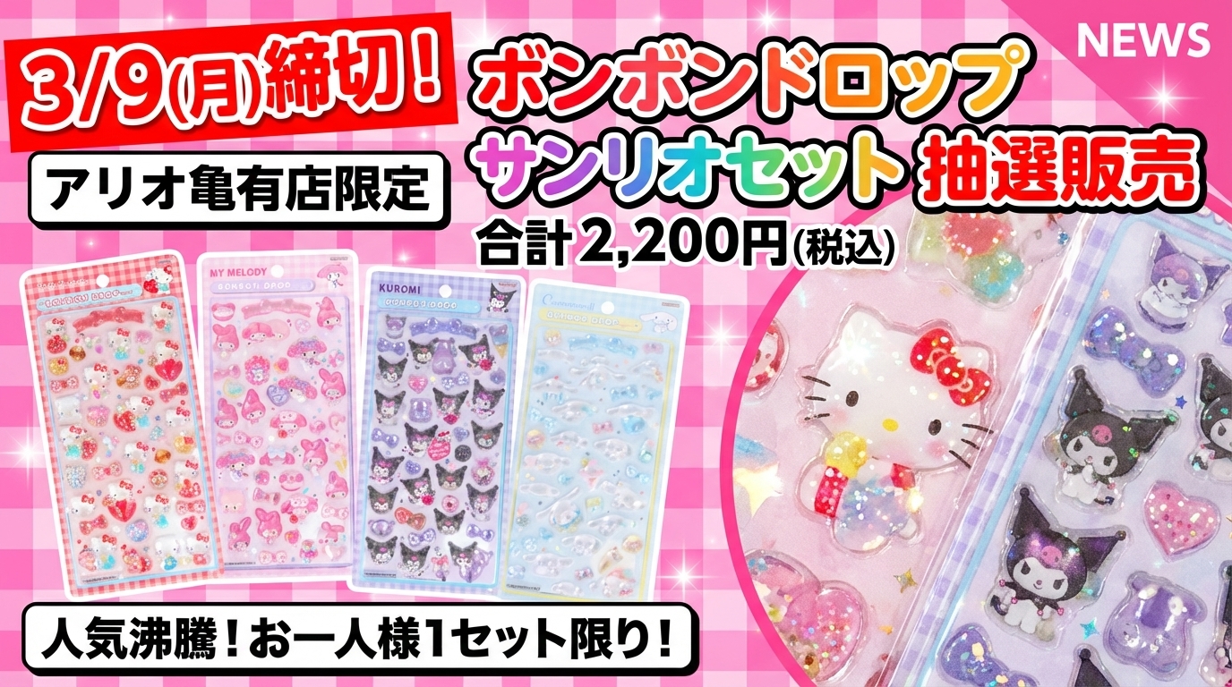 SNSや子供たちの間で話題沸騰中の「ボンボンドロップシール」。その人気キャラクターセットが、東京都葛飾区にある「パーティリコ アリオ亀有店」にて抽選販売されることが決定しました。今回は混雑緩和と安全確保の観点から、LivePocketを使用した事前抽選制となります。