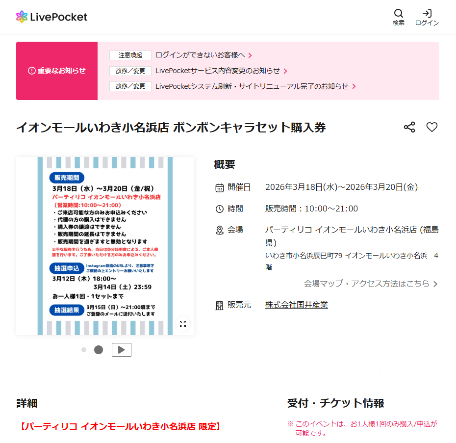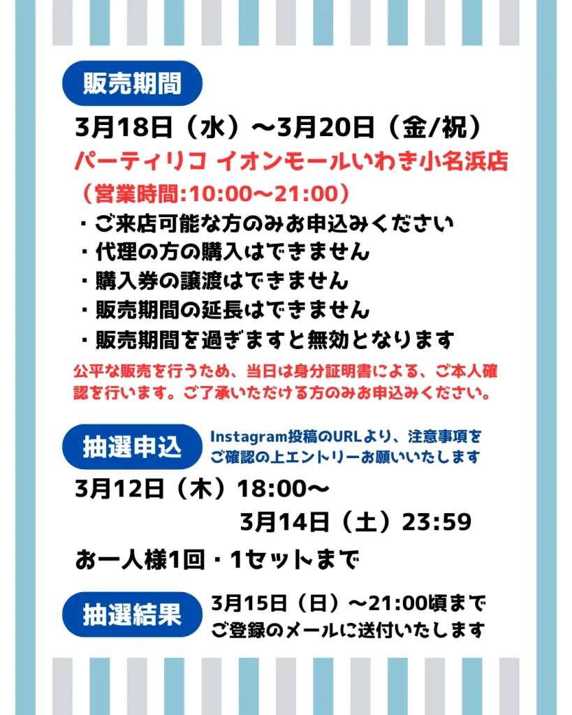 見事当選された方は、案内された販売期間内である3月18日から3月20日の間に、パーティリコ イオンモールいわき小名浜店のレジまでお越しください。当選者のための在庫はしっかりと確保されていますので、期間内であれば品切れの心配はありません。慌てずにご来店ください。