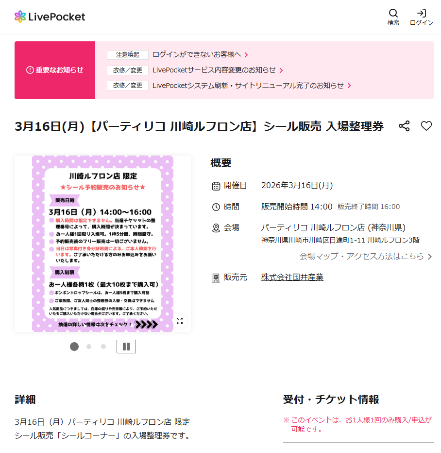 神奈川県川崎市にあるパーティリコ 川崎ルフロン店にて、シールコーナーへの入場と商品購入のための整理券申し込みが開始されています。