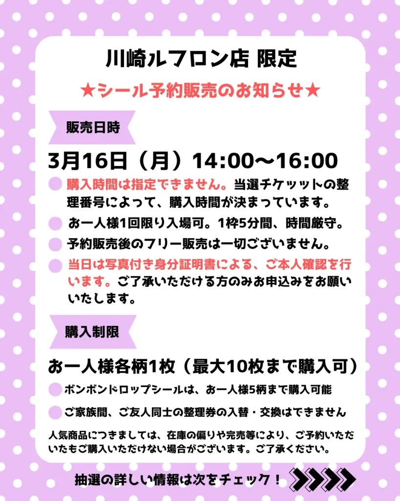 また、当選チケットはあくまでシールコーナーへ入場するための整理券であり、商品の在庫確保を保証するものではありません。特にボンボンドロップシールは入荷数が非常に少ないため、入場したタイミングによってはすでに完売となっている可能性があることをあらかじめ理解した上でお申し込みください。