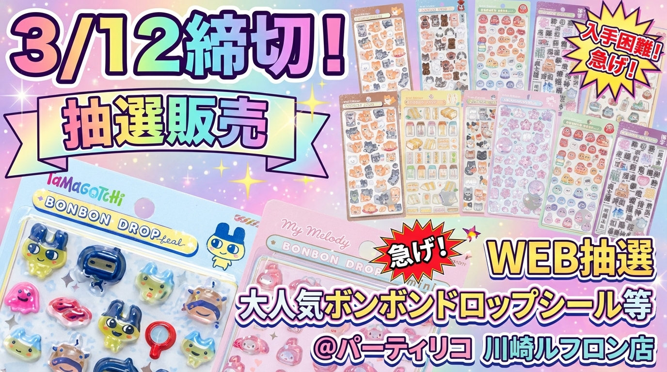 【3/12締切】大人気ボンボンドロップシール等の抽選販売が決定!@パーティリコ 川崎ルフロン店