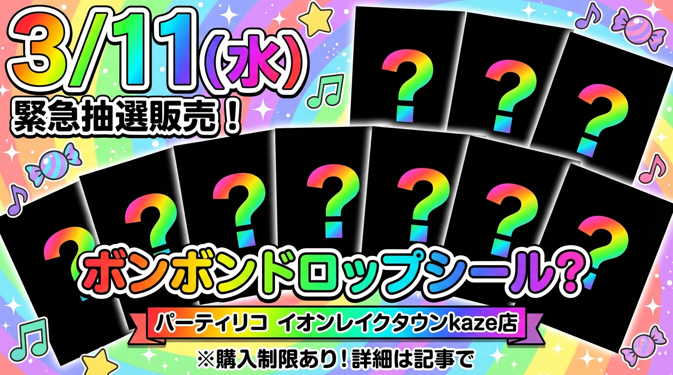 埼玉県越谷市にあるイオンレイクタウンkaze内の「パーティリコ」にて、大人気商品「ボンボンドロップシール」を含むシール商品の抽選販売が行われることが決定しました。