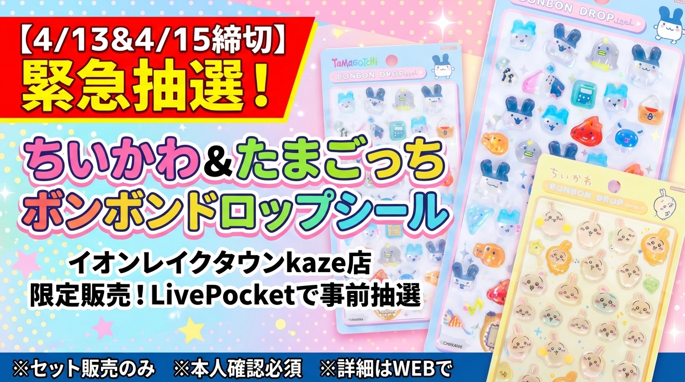 埼玉県越谷市の大型ショッピングモール、イオンレイクタウンkaze内にあるパーティリコにて、SNSで話題沸騰中のアイテム、ボンボンドロップシールの抽選販売が実施されることが決定しました。今回の抽選対象となるのは、絶大な人気を誇るちいかわシリーズと、懐かしさと可愛さで注目を集めるたまごっちシリーズの2種類です。