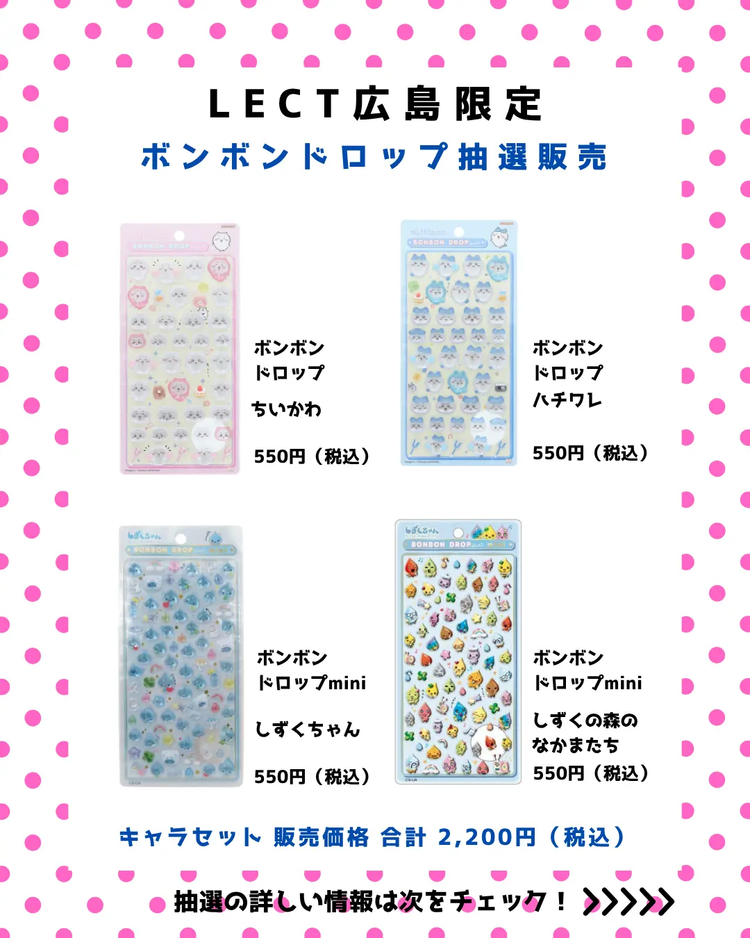 今回のパーティリコ LECT広島店でのボンボンドロップシール抽選販売は、ちいかわとしずくちゃんのセットが一度に手に入る貴重な機会です。3月23日までの短い申込期間を逃さないよう、早めにLive Pocketでのエントリーを済ませておきましょう。当日は身分証の忘れ物がないようチェックし、マナーを守って買い物を楽しんでください。