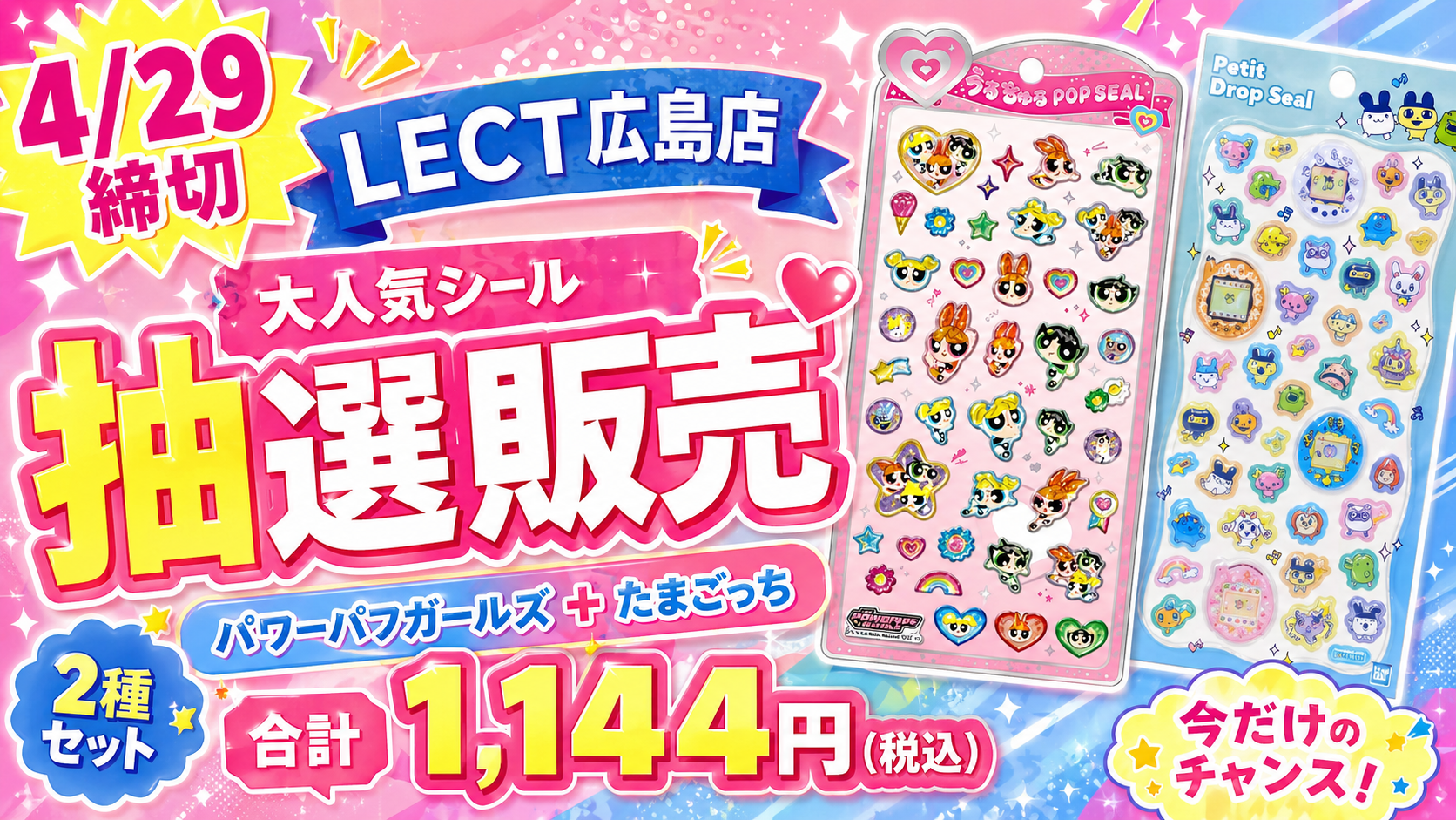 パーティリコ LECT広島店で、パワーパフガールズとたまごっちのキャラセット購入券の抽選販売が実施されます。