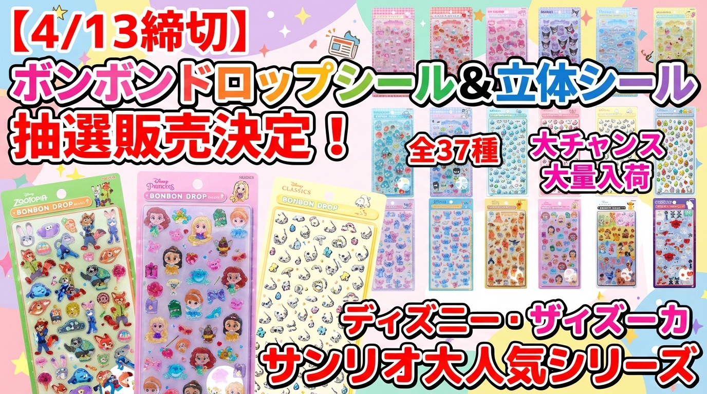【4/13締切】全37種!ディズニー・サンリオ大・しずくちゃんのボンボンドロップシール+αの抽選販売が決定!@栄ロフト|過去最大級の抽選が始まる!