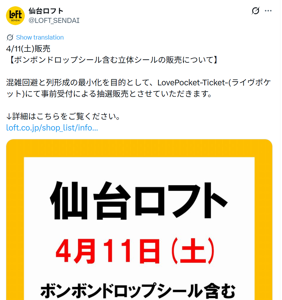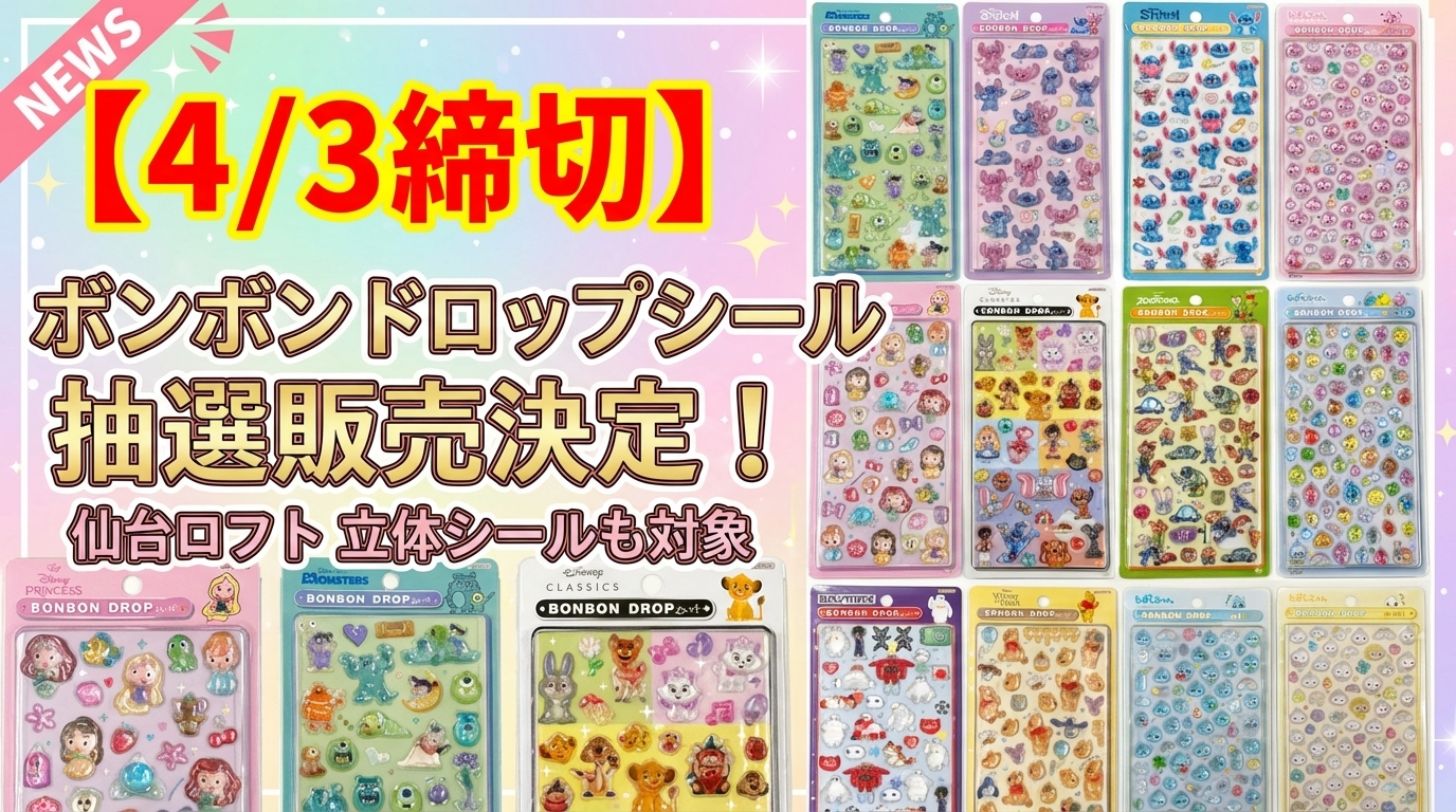 SNSや口コミで話題沸騰中のボンボンドロップシールをはじめとする立体シール類について、仙台ロフトでの販売方法が発表されました。非常に高い人気を誇る商品であるため、混雑回避と安全確保を目的とした事前抽選制による入場制限が行われます。