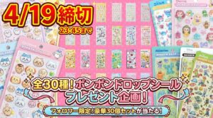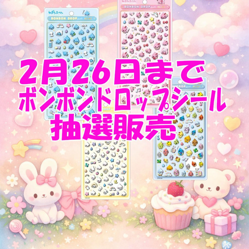 今回は、ボンボンドロップシールのしずくちゃんミニシリーズの抽選販売についてお伝えしました。システム購入を防ぐための措置として抽選形式が採用されており、先着順ではないため2月26日の23:59までゆっくりと応募が可能です。