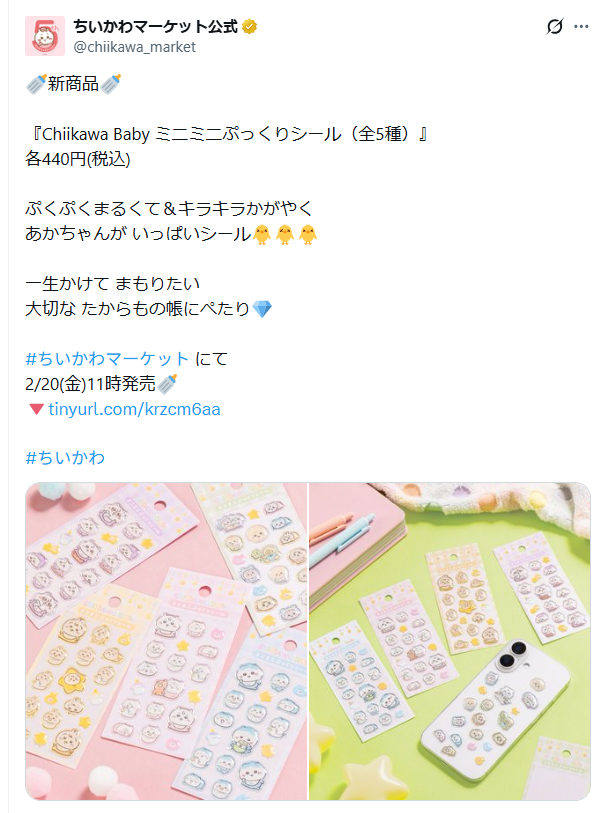 2月20日(金)11時から、ちいかわマーケットにて「Chiikawa Baby ミニミニぷっくりシール」が発売されます。全5種、各440円という集めやすい価格と、何より「あかちゃん姿」のちいかわたちが最高にキュートなアイテムです。