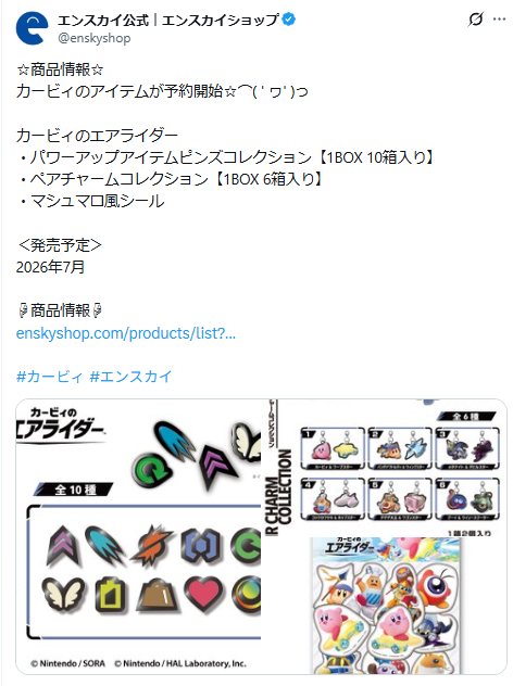 Nintendo Switch 2の注目タイトルであるカービィのエアライダーから登場する、マシュマロ風シール、ペアチャーム、パワーアップアイテムピンズの3種類をご紹介しました。ゲームの世界観をリアルで楽しめる魅力的なグッズばかりですので、ファンの方はぜひ早めの予約をご検討ください。