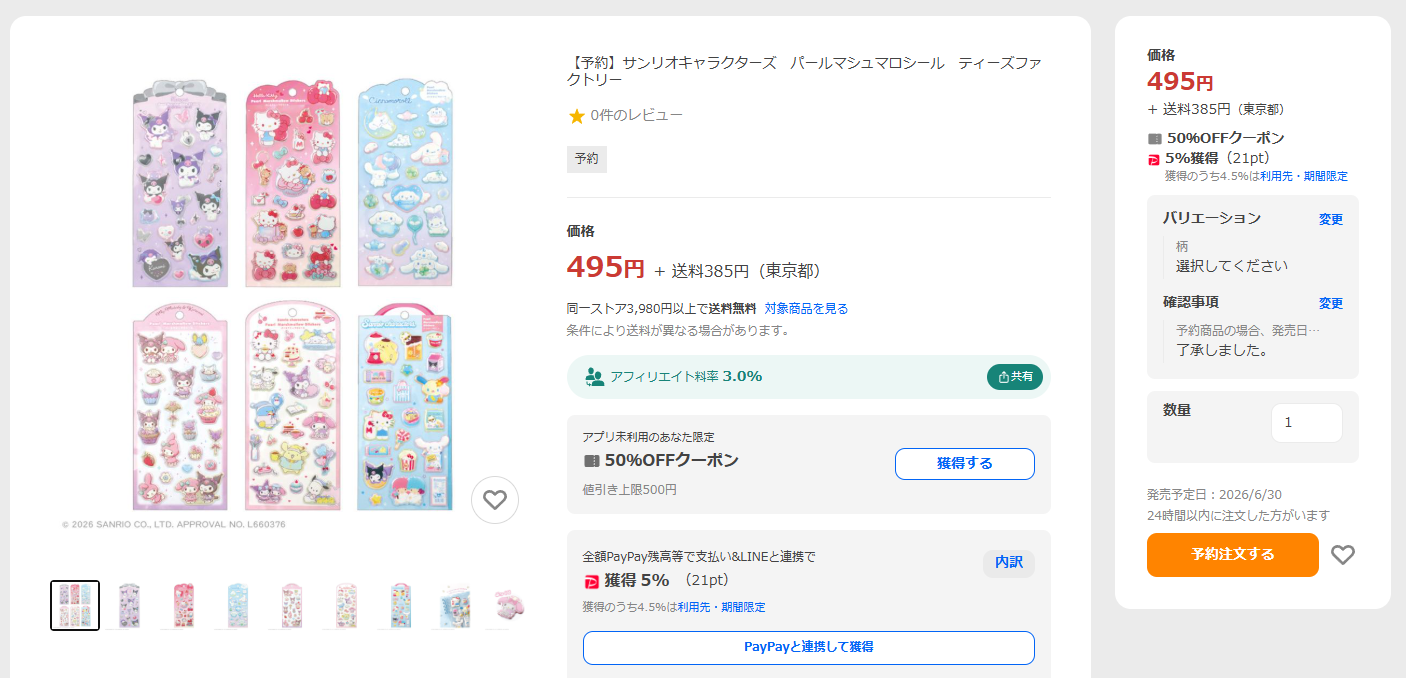この「パールマシュマロシール」ですが、公式オンラインショップ等ですでに予約受付がスタートしています。サンリオの新作シール、特に今回のような特殊加工が施された凝ったアイテムは、発売後に店頭で探そうと思っても「どこにも売っていない」という状況になりがちです。