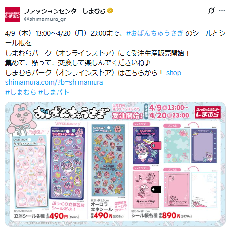しまむらオンラインストアにて受注販売が開始される、おぱんちゅうさぎの新作りったいシールとシール帳について紹介しました。