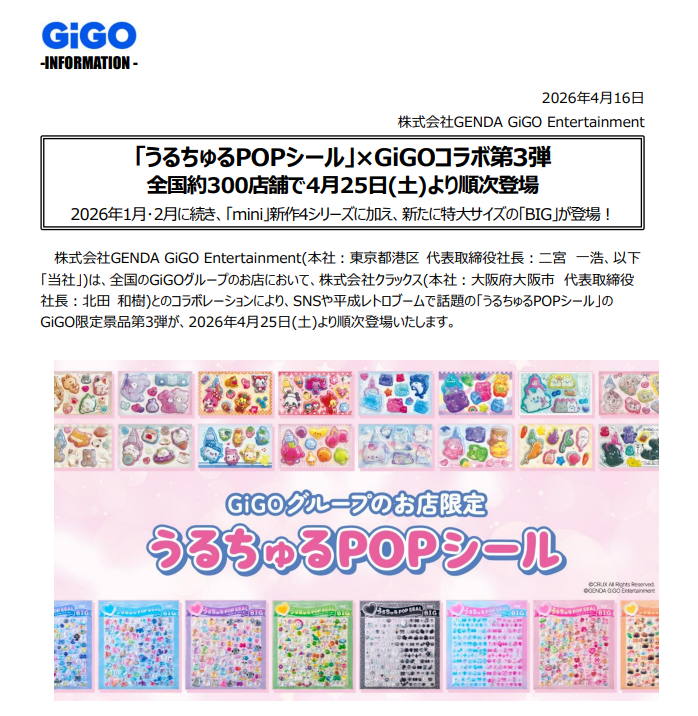 SNSで話題沸騰のうるちゅるPOPシールのGiGO限定第3弾は、2026年4月25日土曜日より全国約300店舗で順次展開されます。
