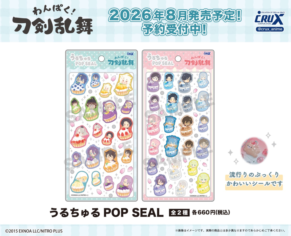 大人気のわんぱく!刀剣乱舞から、見逃せない新作アイテムが登場しました。ぷっくりとした立体感がたまらなく可愛いうるちゅるPOP SEALの予約受付が、クラックスオンラインストアにてついにスタートしています。