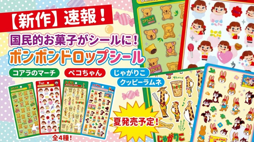 【速報】あの国民的お菓子がシールに!?コアラのマーチ、ペコちゃん、じゃがりこ、クッピーラムネの新作「ボンボンドロップシール」が夏に登場決定!
